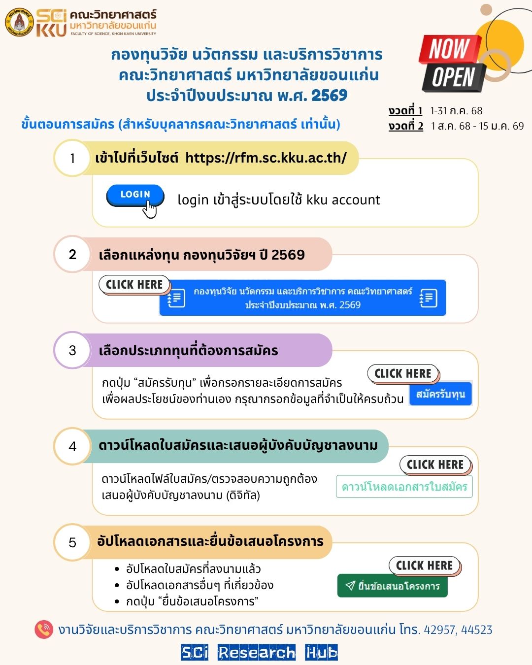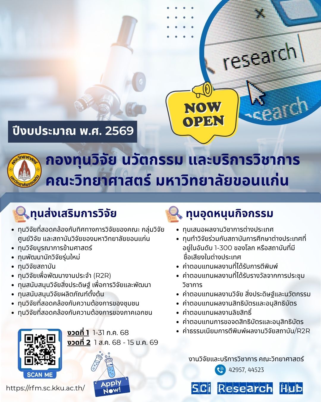 ตามประกาศคณะวิทยาศาสตร์ ฉบับที่ 115/2568 เรื่อง การขอใช้เงินกองทุนวิจัย นวัตกรรม และบริการวิชาการ คณะวิทยาศาสตร์มหาวิทยาลัยขอนแก่น ประจำปีงบประมาณ พ.ศ. 2569 ลงวันที่ 11 กันยายน 2568